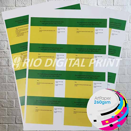 Print Digital Laser Full Color Bahan Kertas Art Paper 260 Gram A3 Plus 32x48cm Bahan terlihat agak mengkilap.