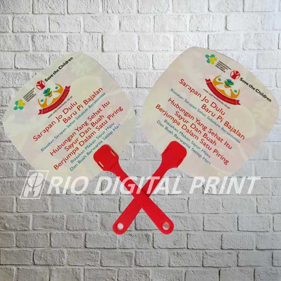 Kipas Promosi dicetak dengan laser print, bahan art paper di laminasi 2 sisi Ukuran Kipas 15x15 cm bentuk bisa bulat, atau custom