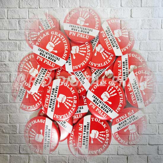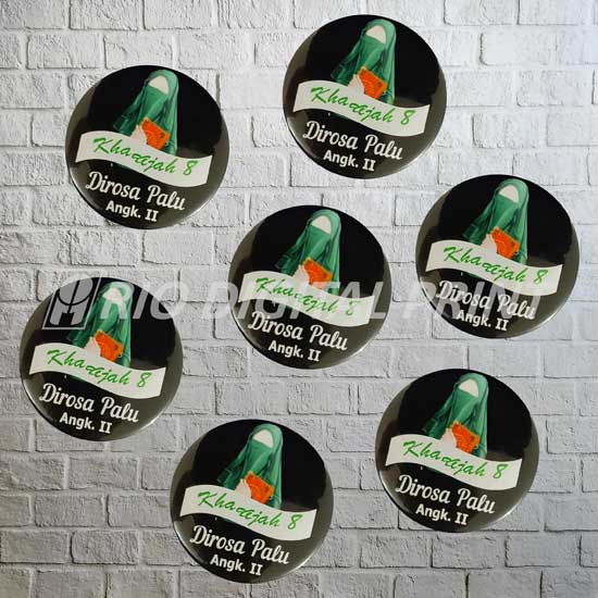 Pin peniti bahan bagian belakang plastik, bagian depan seng dilapisi plastik dan laminasi Sudah termasuk laminasi glossy / doff agar tidak mudah rusak jika terkena hujan Dicetak dengan print laser tidak mudah pudar