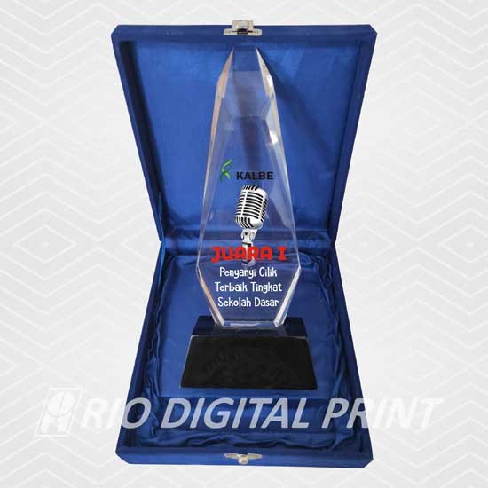 Plakat Akrilik berbentuk sesuai gambar uk. 21x8 cm, tebal 20 mm, dicetak dengan mesin uv, termasuk box plakat beludru.