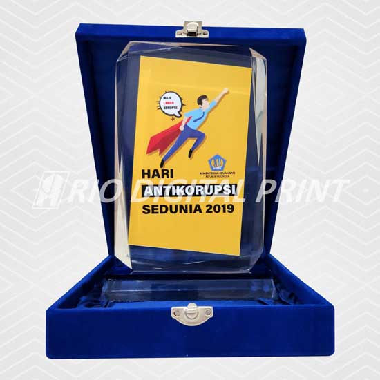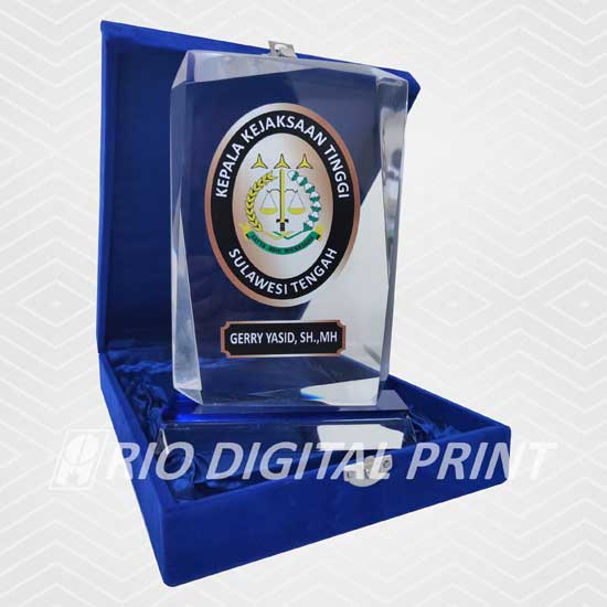 Plakat Akrilik berbentuk sesuai gambar uk. 18x12cm, tebal 15 mm, dicetak dengan mesin uv, termasuk box plakat beludru.