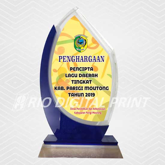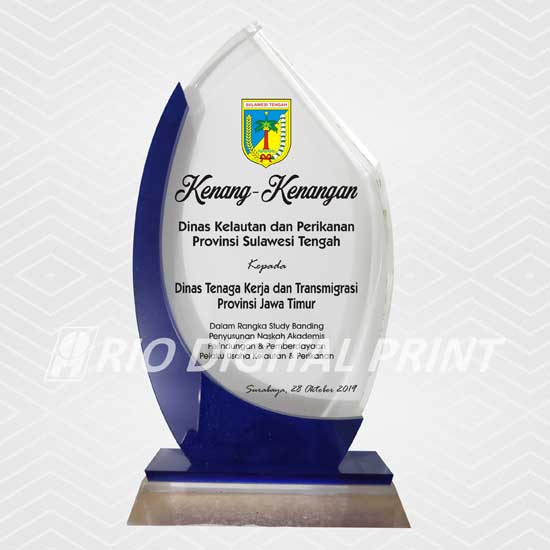 Plakat Akrilik bentuk sesuai gambar, uk. 11,5x20,5cm, tebal 15 mm, dicetak dengan mesin uv, termasuk box plakat beludru.