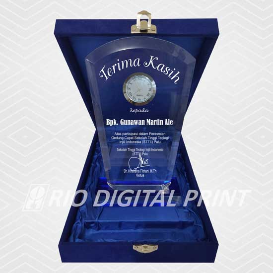 Plakat Akrilik berbentuk sesuai gambar uk. 19x11,8 cm, tebal 15 mm, + Jam, dicetak dengan mesin uv, termasuk box plakat beludru.