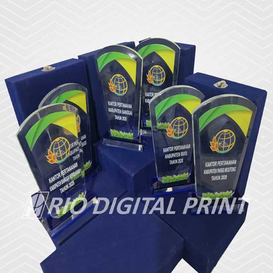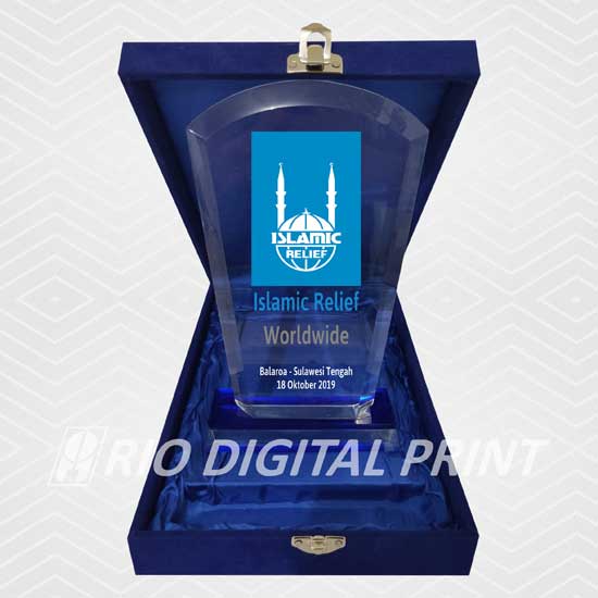 Plakat Akrilik berbentuk sesuai gambar uk. 19x11,8 cm, tebal 15 mm, dicetak dengan mesin uv, termasuk box plakat beludru.