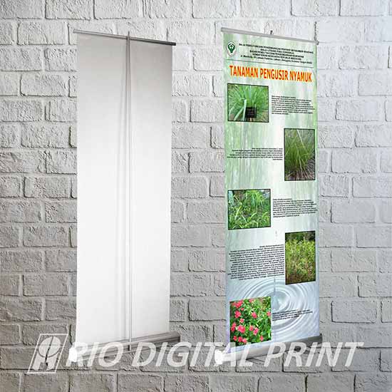 Roll Banner di cetak di bahan Albatros High Resolution Ukuran 60x160cm Cetak Satu Sisi dengan mesin banner digital Fullcolor Bahan roll banner alumunium free tas roll banner