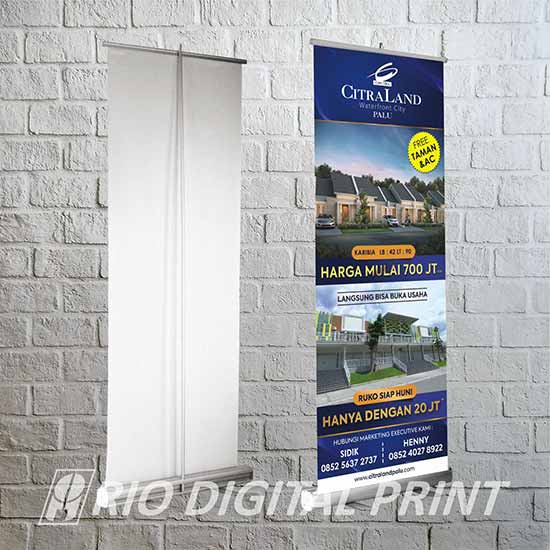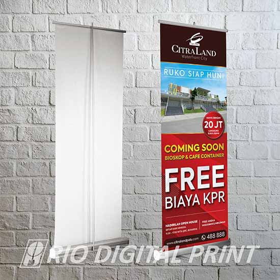 Roll Banner di cetak di bahan Albatros High Resolution Ukuran 80x200cm Cetak Satu Sisi dengan mesin banner digital Fullcolor Bahan roll banner alumunium free tas roll banner